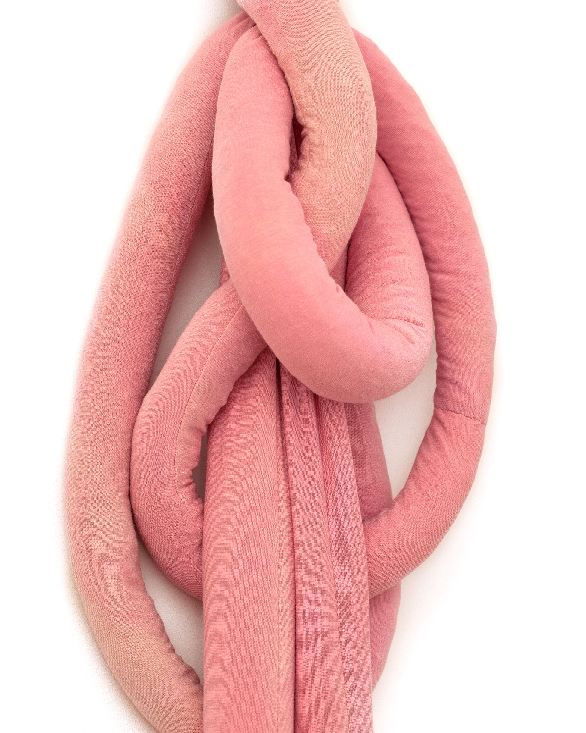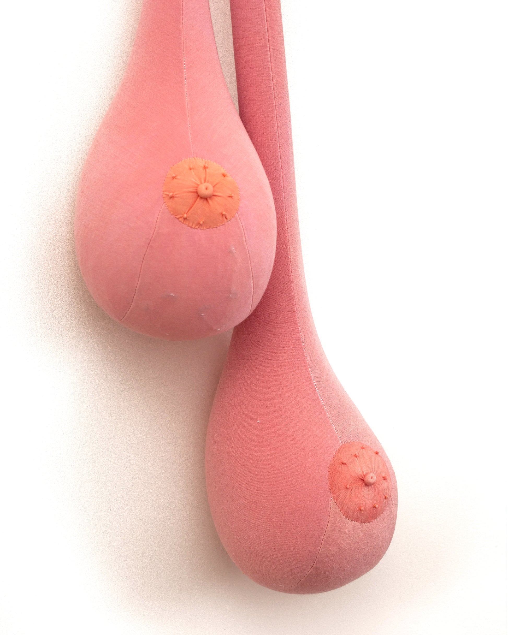A soft sculpture hung on hook, made from pink jersey, nude light textile and filled with weighted beans.