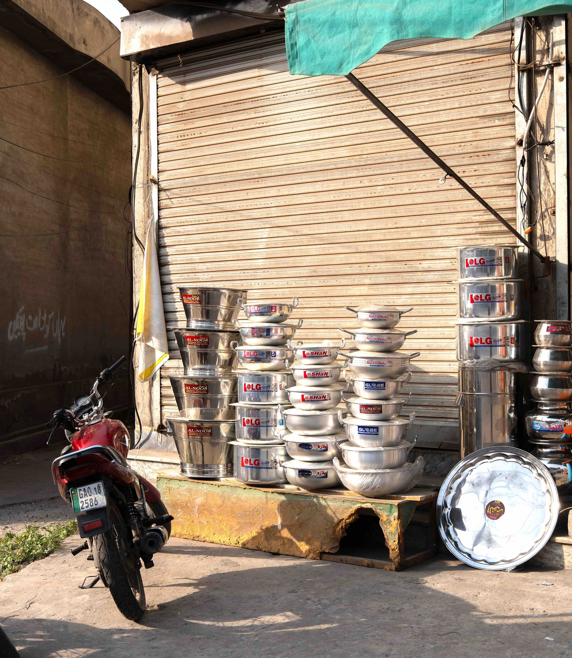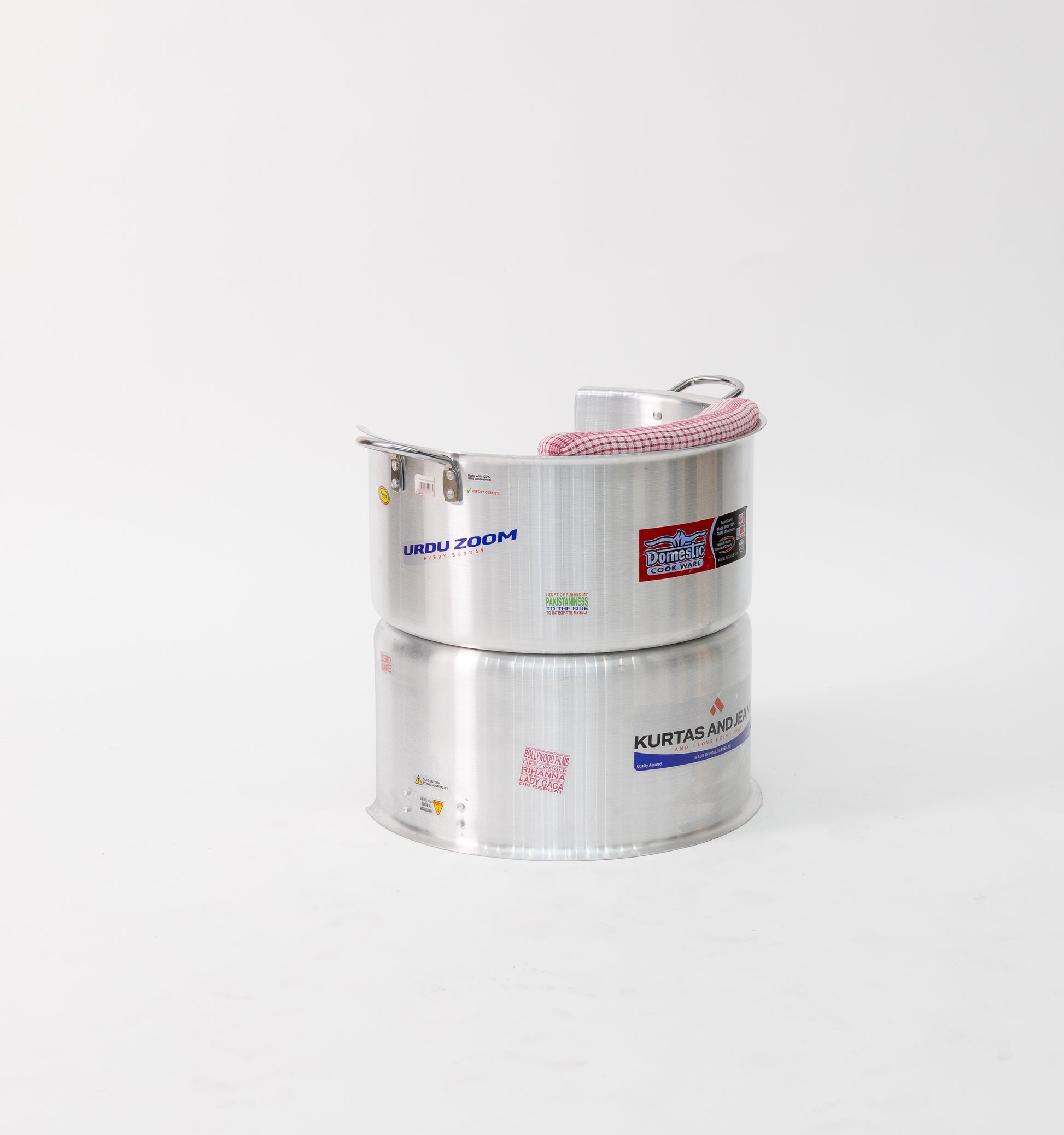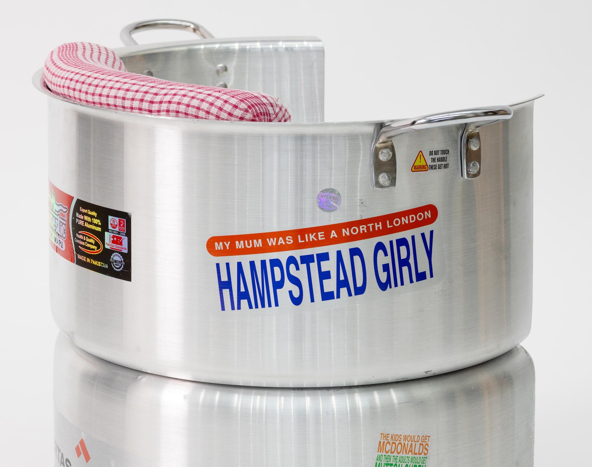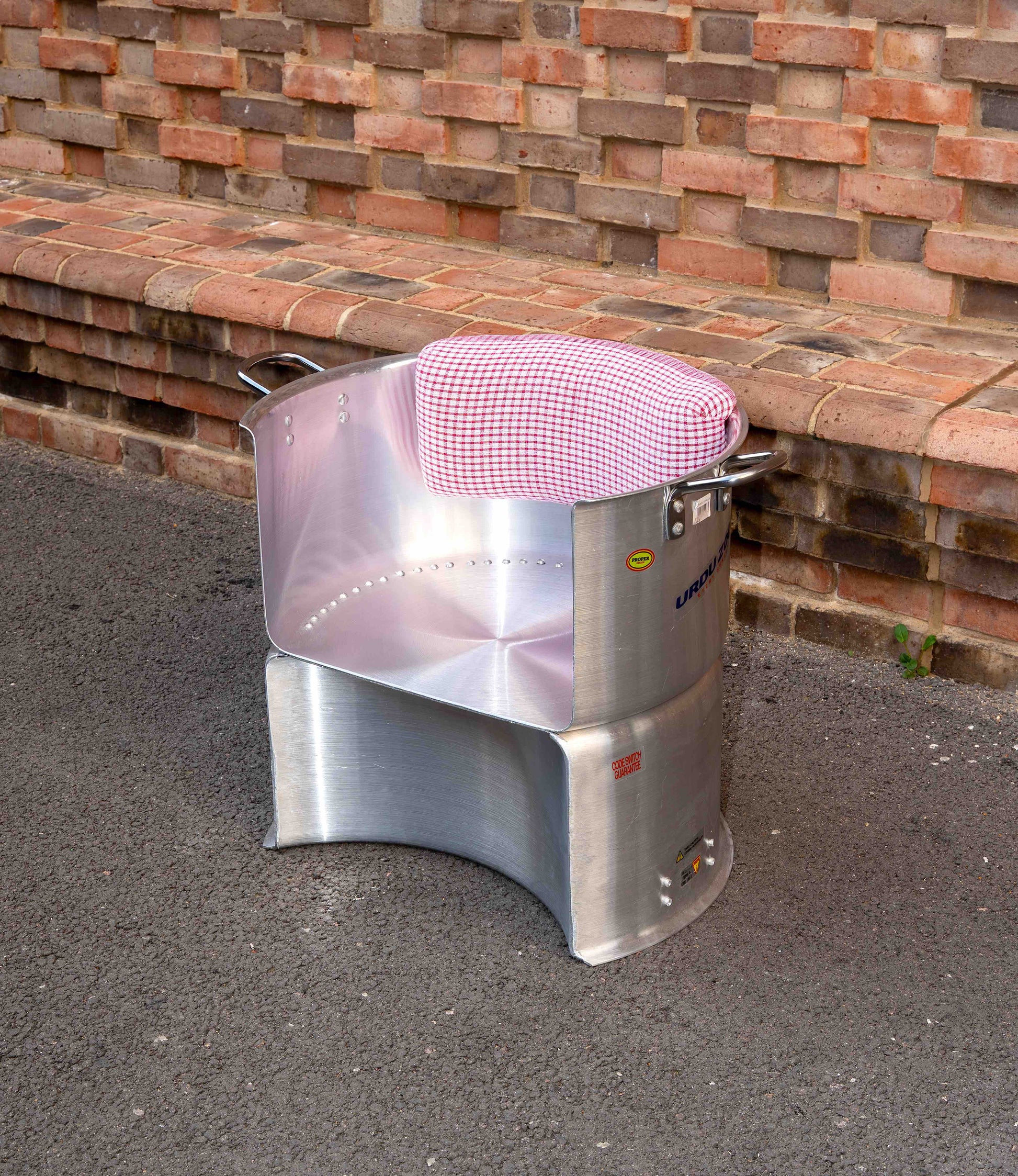 The Handi Chair, created by Saym Hussain, a London-based designer from Glasgow, reworks aluminium handis from London's vibrant Shepherd’s Bush Market. Each piece embodies a materially diasporic journey: British scrap metal travels to Pakistan to be made into pots, then returns to the UK to be sold in local markets.