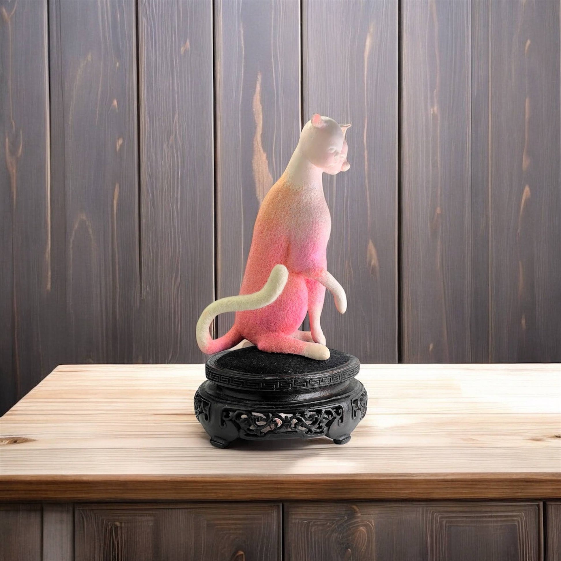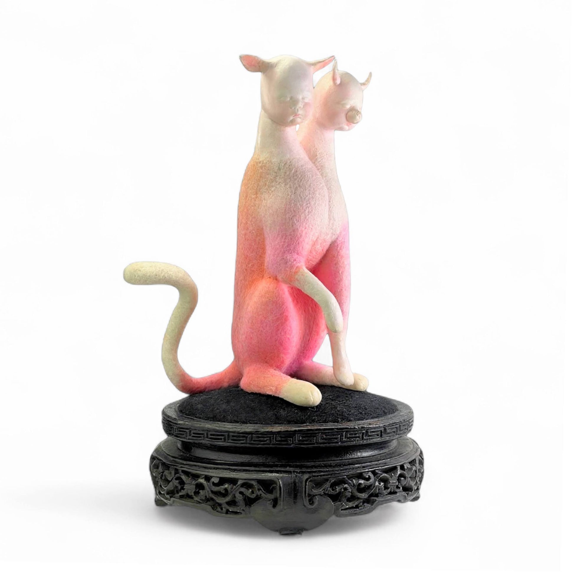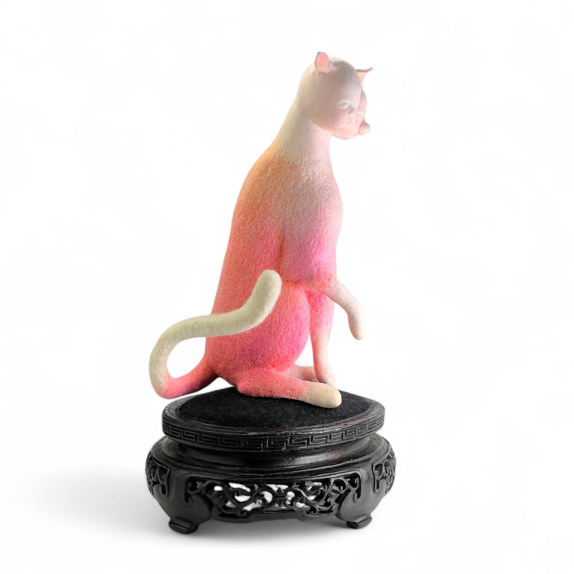 This two-headed feline form explores identity, inner conflict, and transformation. The needle felted piece, made of merino wool, rests on an antique wood vase base, part of the artist collection, that has been customised adding black felted wool on its surface.