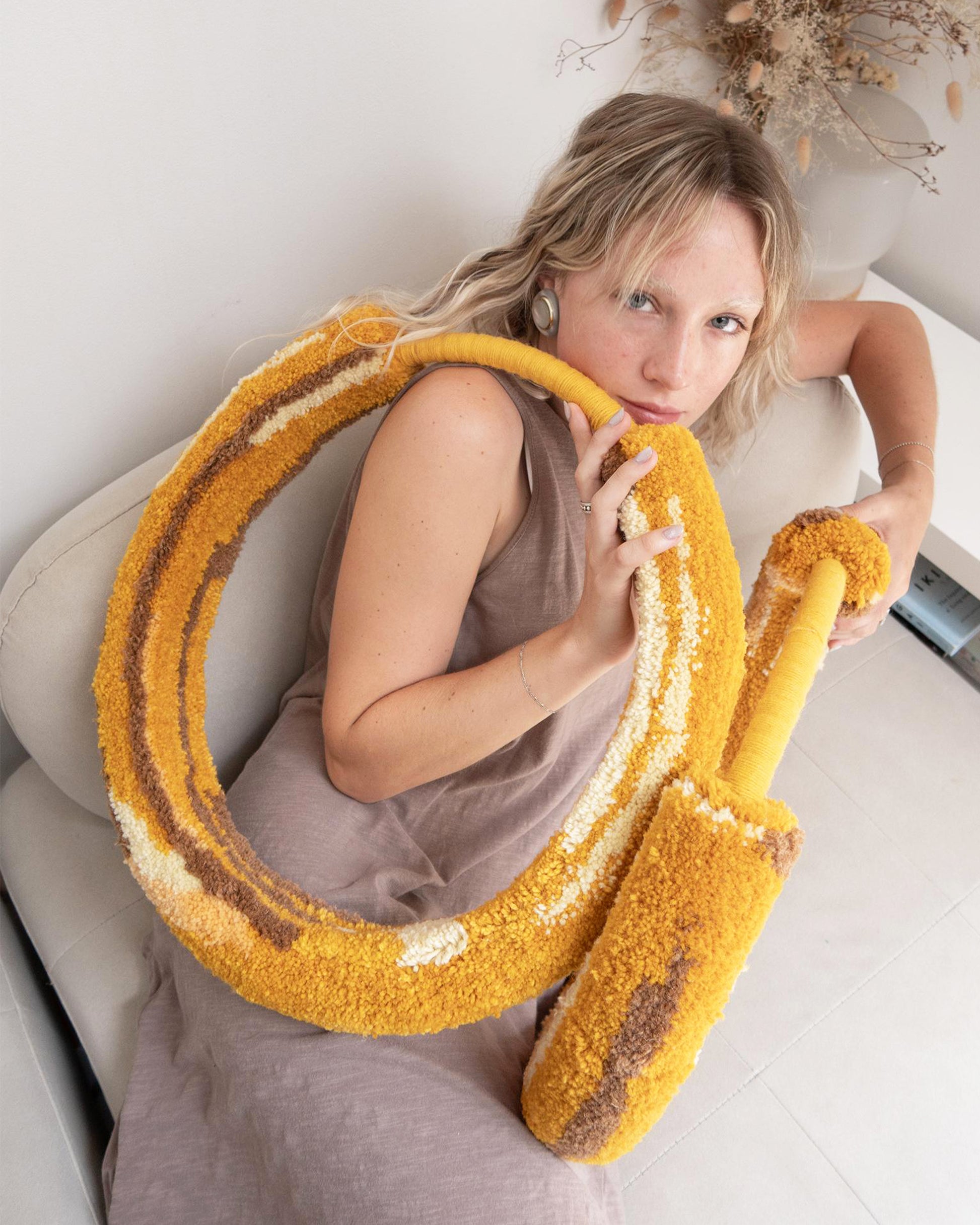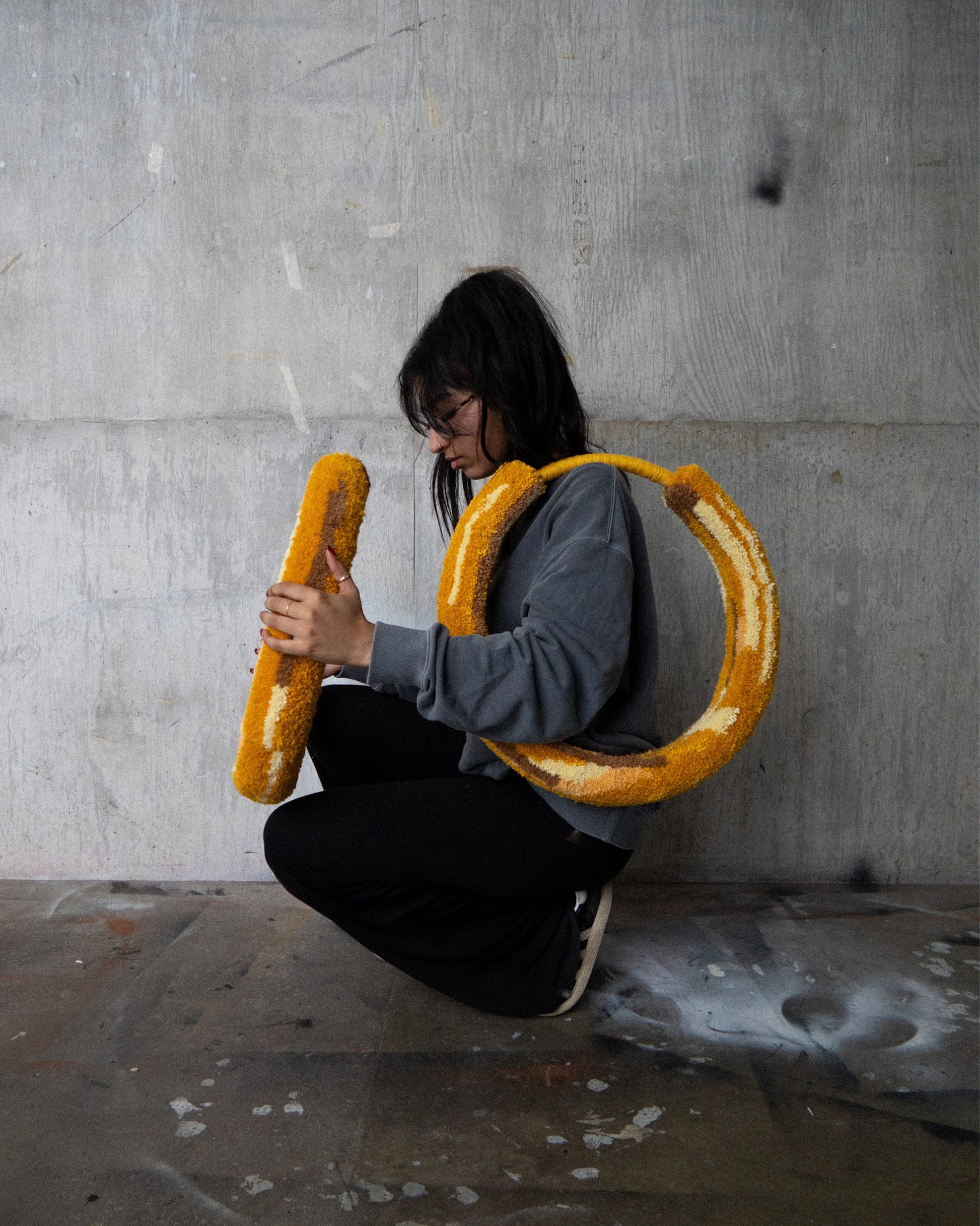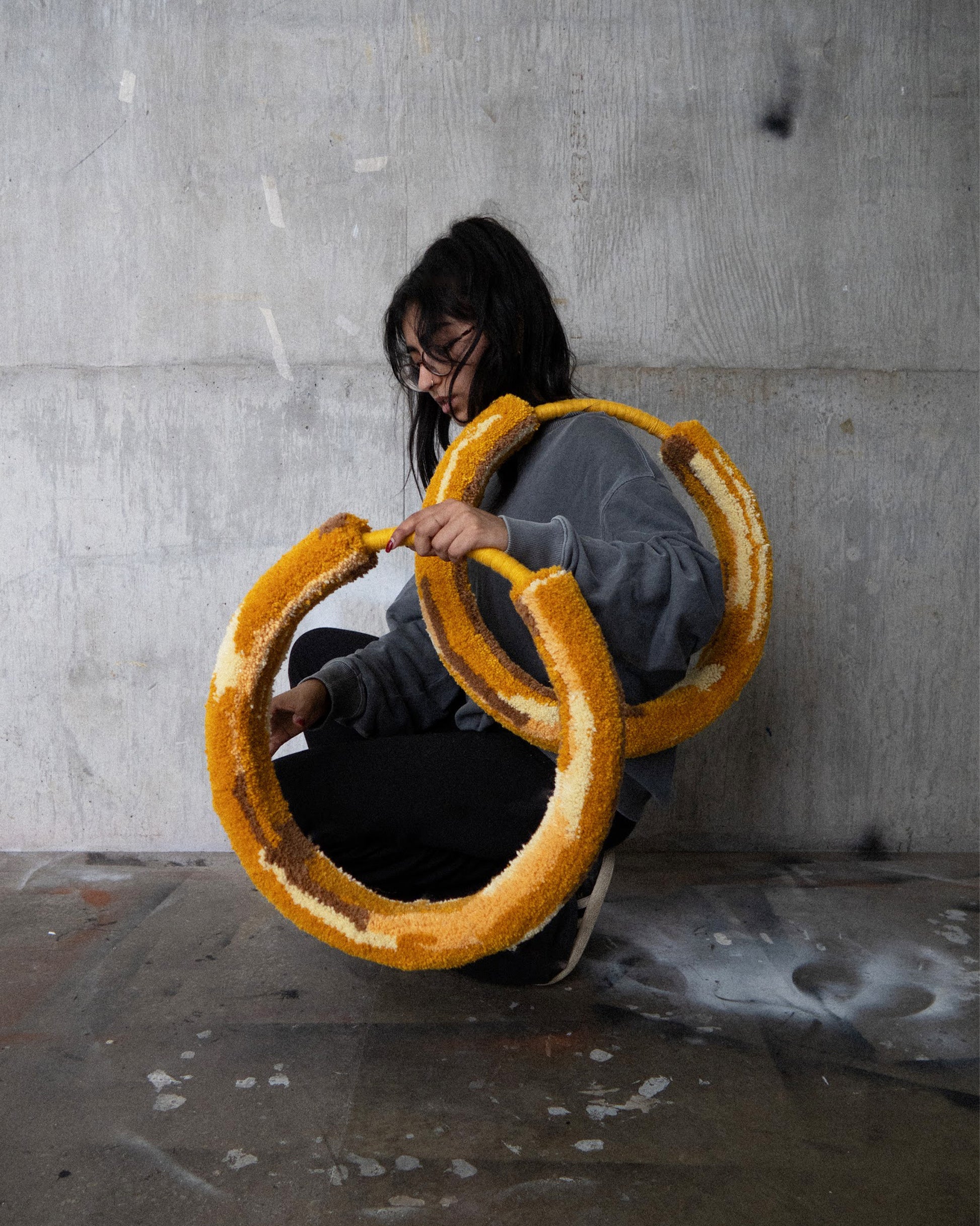 The 18K 'Gold' Hoop Earrings, made using tufted New Zealand wool play with a surreal proportion and material of a timeless classic – Hoop Earrings: supposedly crafted in 18k gold.
