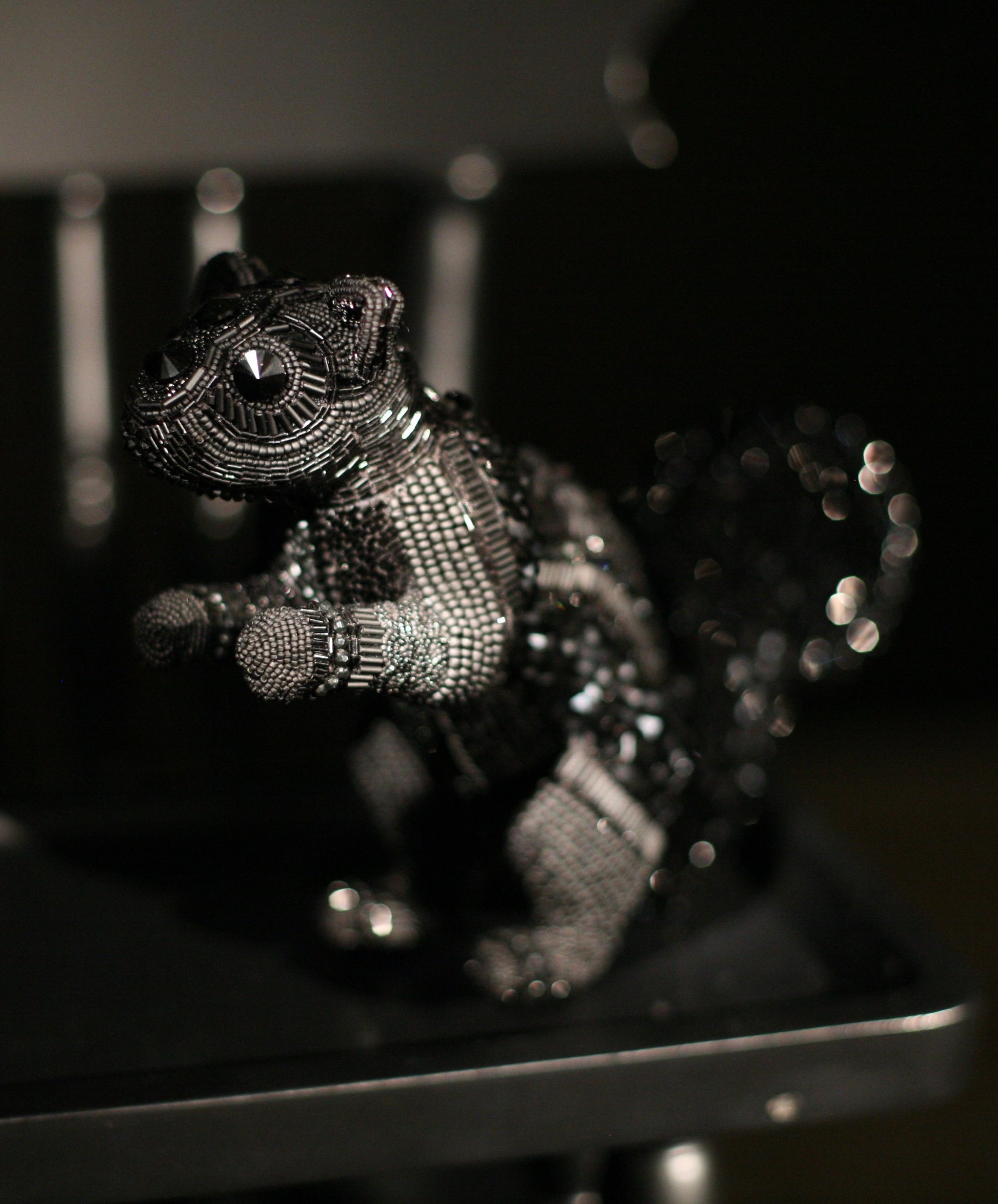 Whether dreams or nightmares, new or dark creatures emerged from The Bedtime Stories, including this exquisitely embroidered in black glass beads squirrel, with its own story to tell.