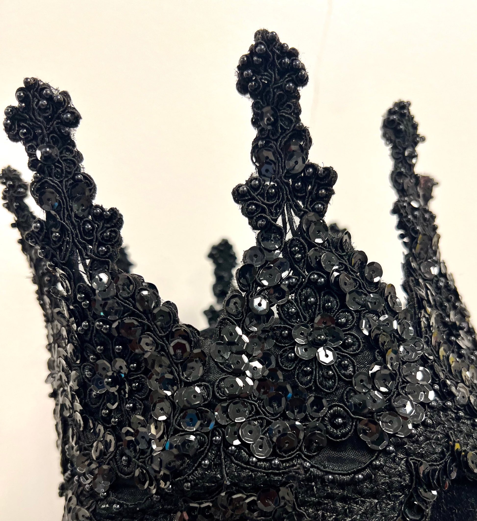 Gothic Cathedral architecture, embodying power and ceremony in whichever theatrics you wish to play. There is a hat elastic to wear at the back of the head allowing the crown to be worn at a perched tilt - or straight on the head as you so wish.
